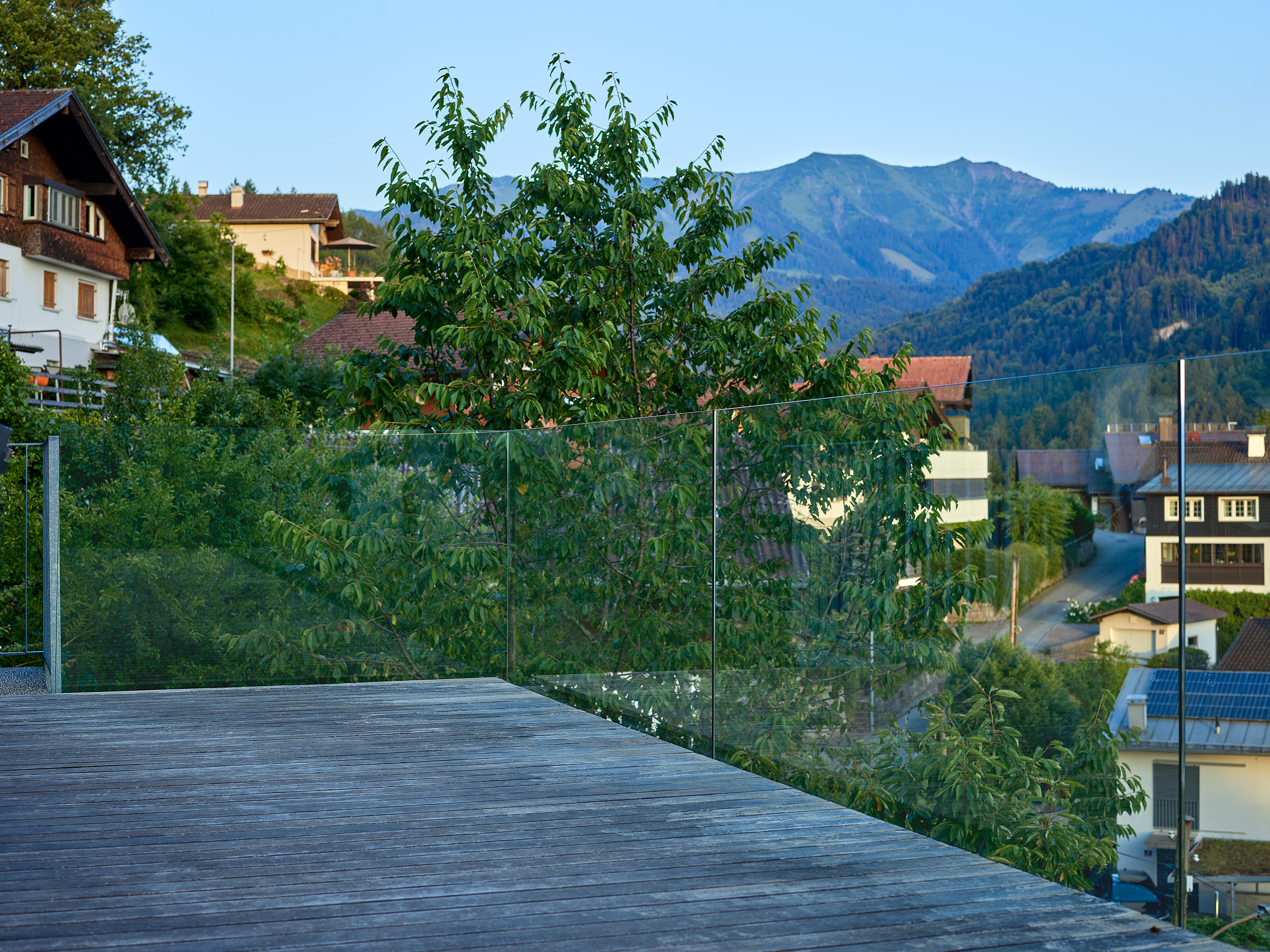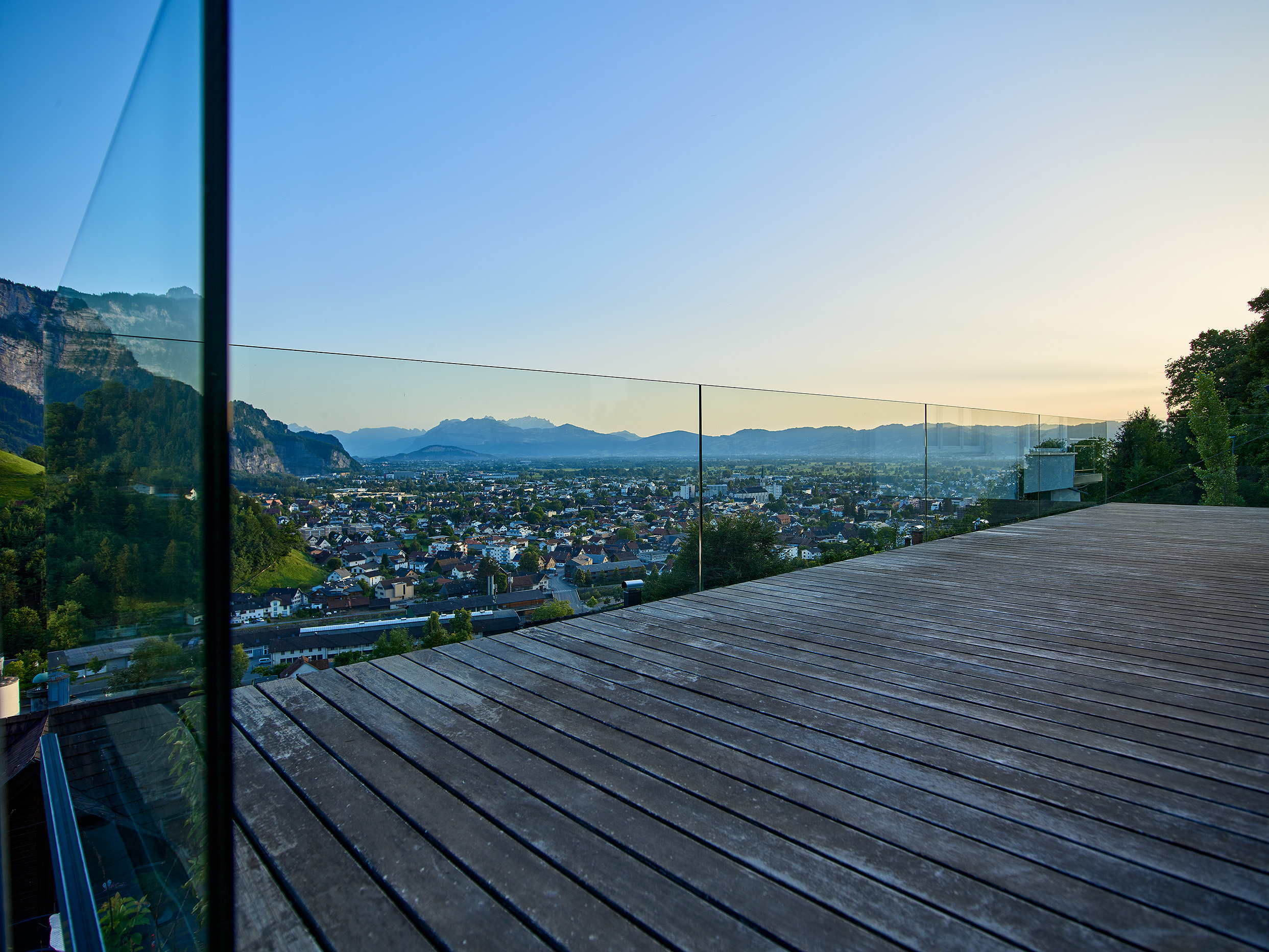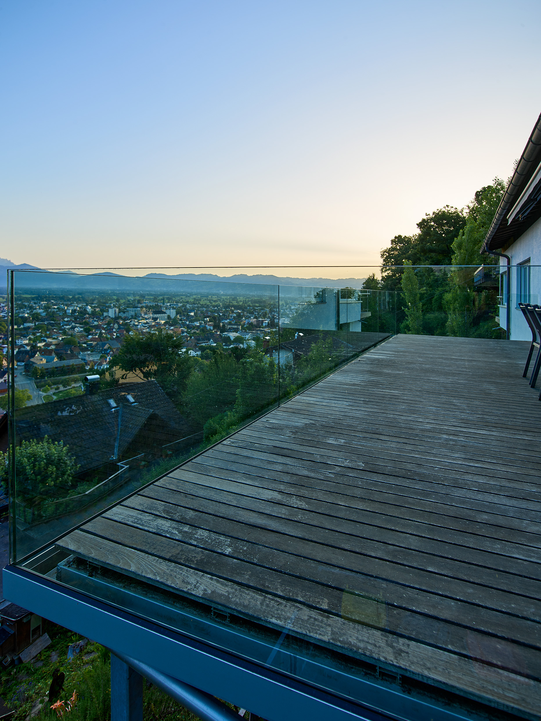 Beim BVH P war die Anforderung der Bauherrschaft recht klar und eindeutig: keinerlei Einschränkung der phänomenalen Aussicht über das Rheintal. Somit wurde ein Nurglasgeländer ohne sichtbare Unterkonstruktion und ohne Handlauf ausgeführt. Die Konstruktion wurde vor den Balkon vorgesetzt, was das Geländer praktisch „unsichtbar“ macht. So kann der Ausblick ohne jegliche Einschränkung genossen werden