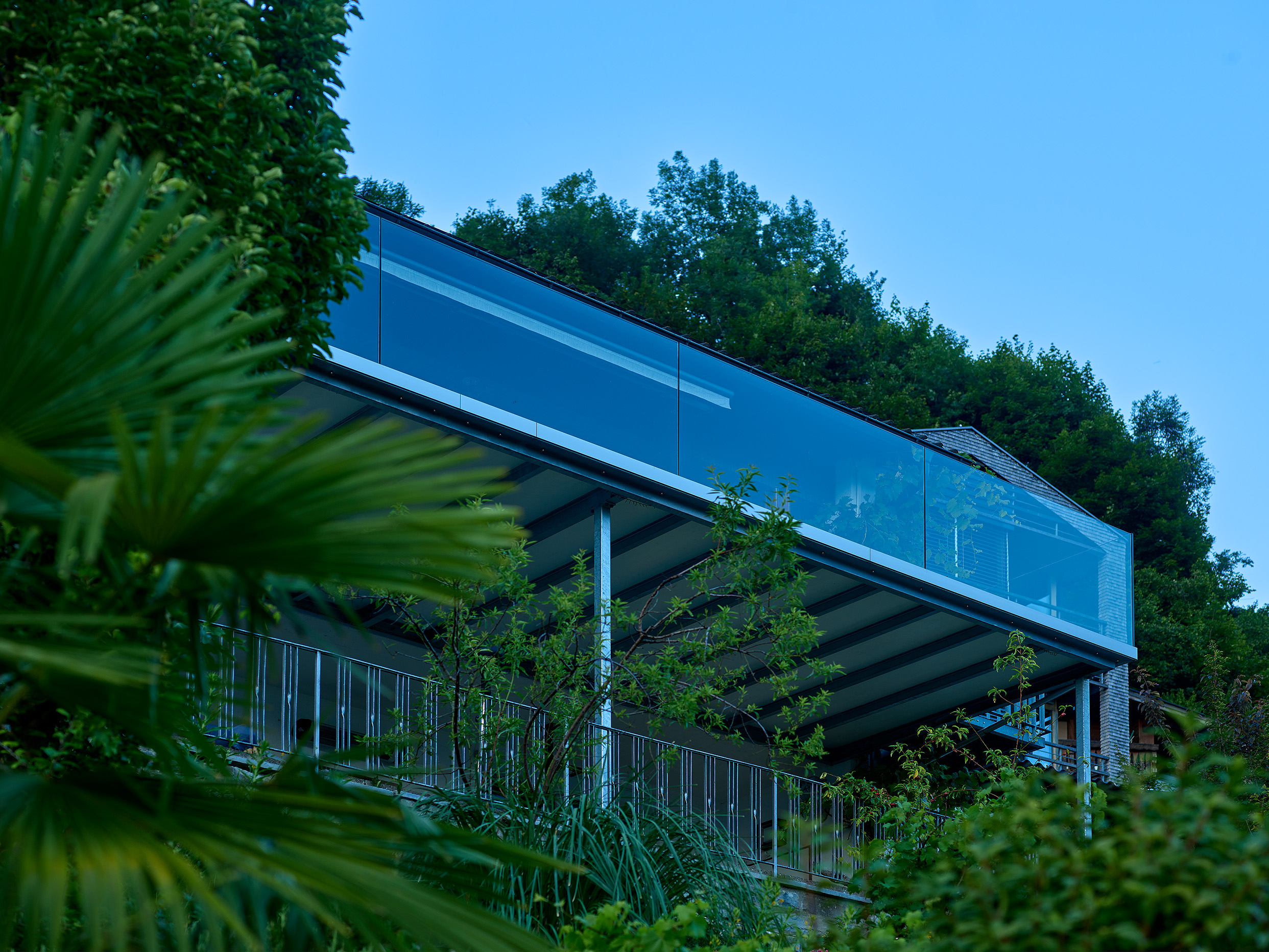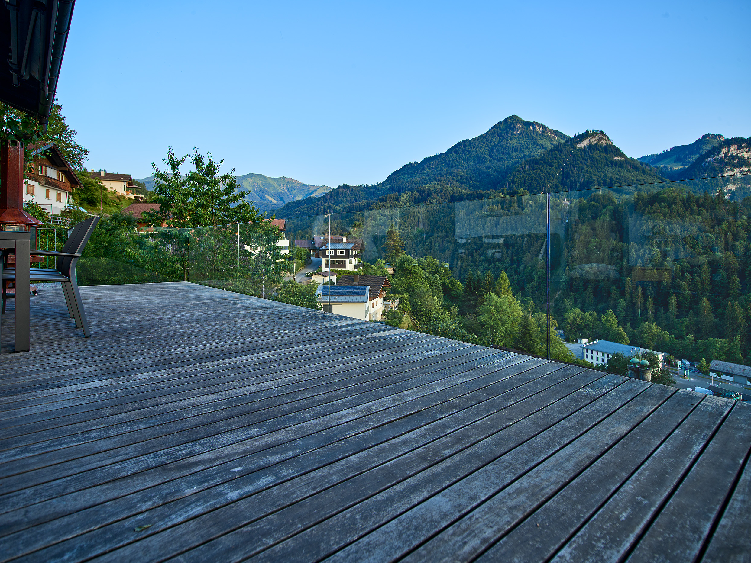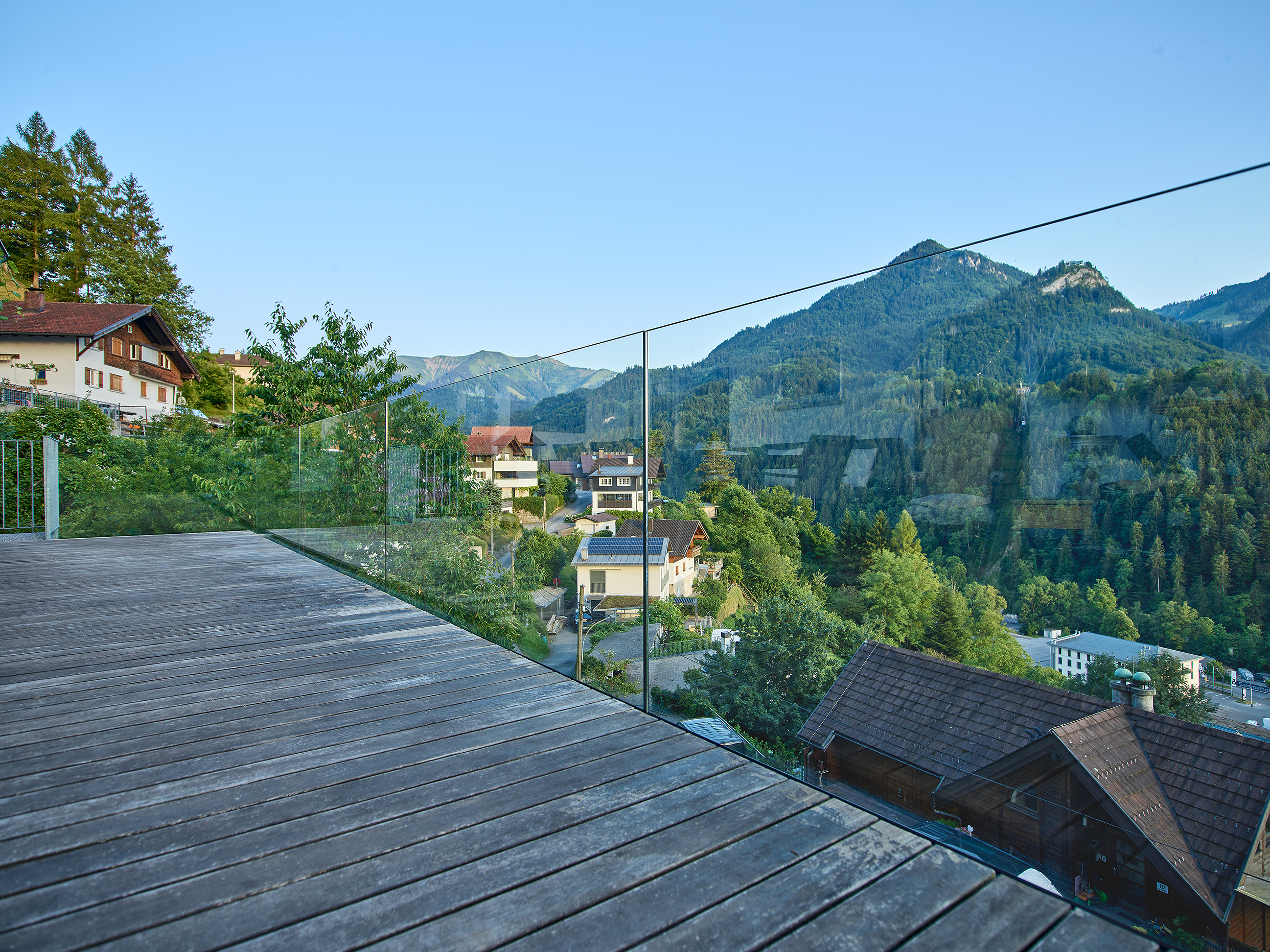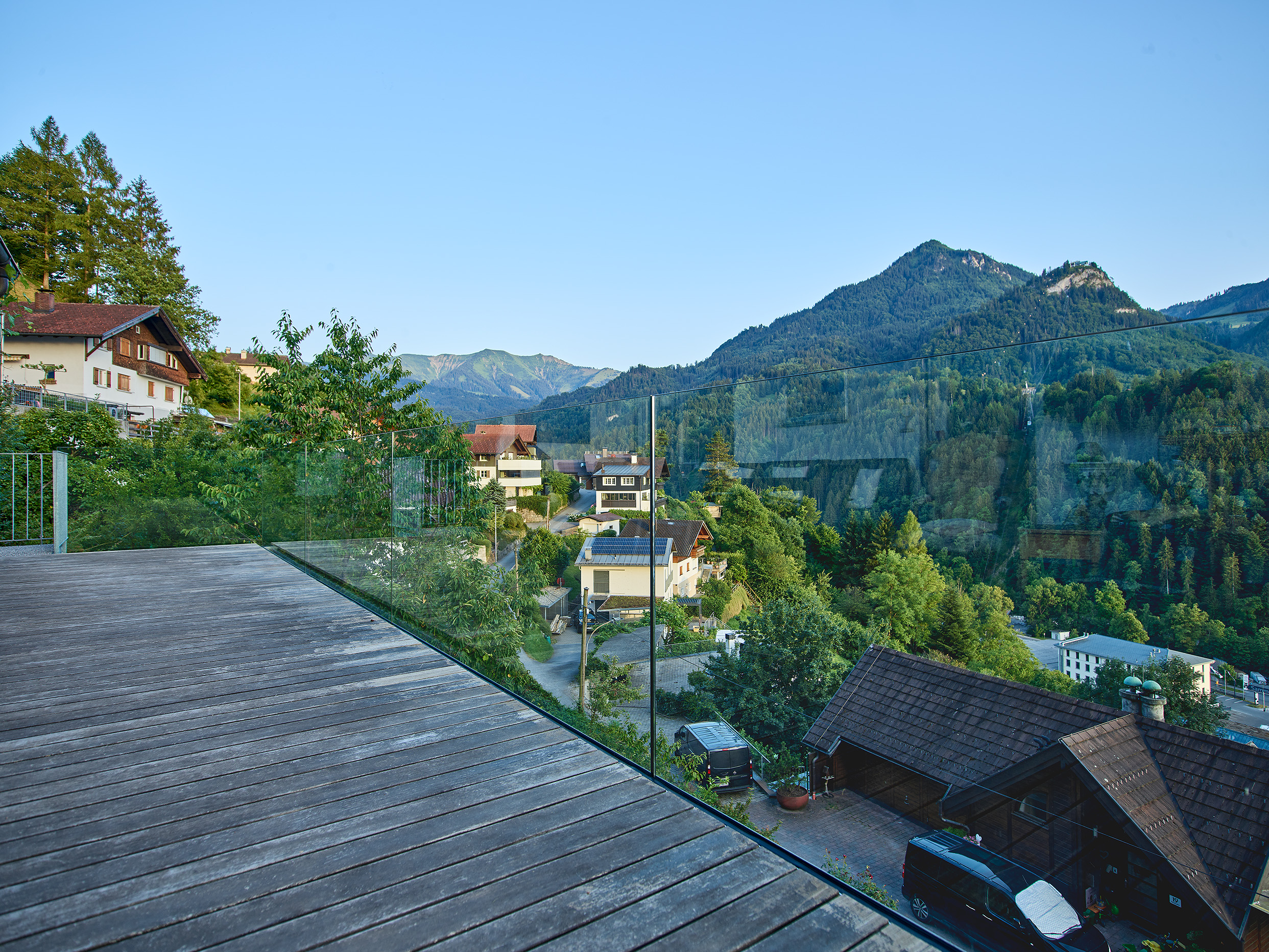 Beim BVH P war die Anforderung der Bauherrschaft recht klar und eindeutig: keinerlei Einschränkung der phänomenalen Aussicht über das Rheintal. Somit wurde ein Nurglasgeländer ohne sichtbare Unterkonstruktion und ohne Handlauf ausgeführt. Die Konstruktion wurde vor den Balkon vorgesetzt, was das Geländer praktisch „unsichtbar“ macht. So kann der Ausblick ohne jegliche Einschränkung genossen werden