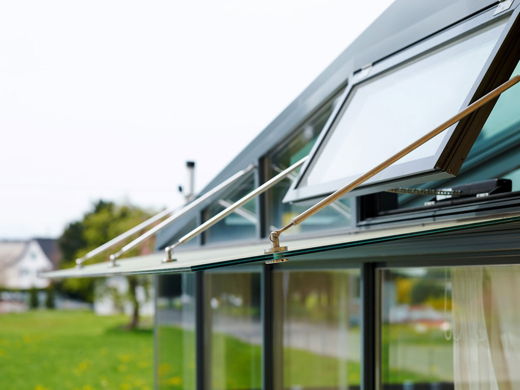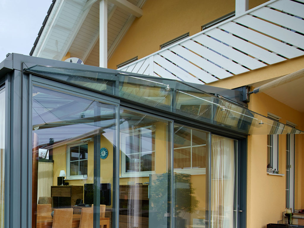 Der ¾-Jahres-Wintergarten der Familie H beeindruckt durch seine großzügige Gestaltung. Er wurde an der Seite einer weitläufigen Terrasse errichtet, die keinen direkten Zugang zum Wohnhaus bietet, sodass die gegenüberliegende Seite weiterhin als offene Terrasse genutzt werden kann. Um einen geschützten Übergang zum Wintergarten zu gewährleisten, wurde eine elegante, abgehängte Vordachverglasung integriert, die trockenen Fußes den Zugang ermöglicht.