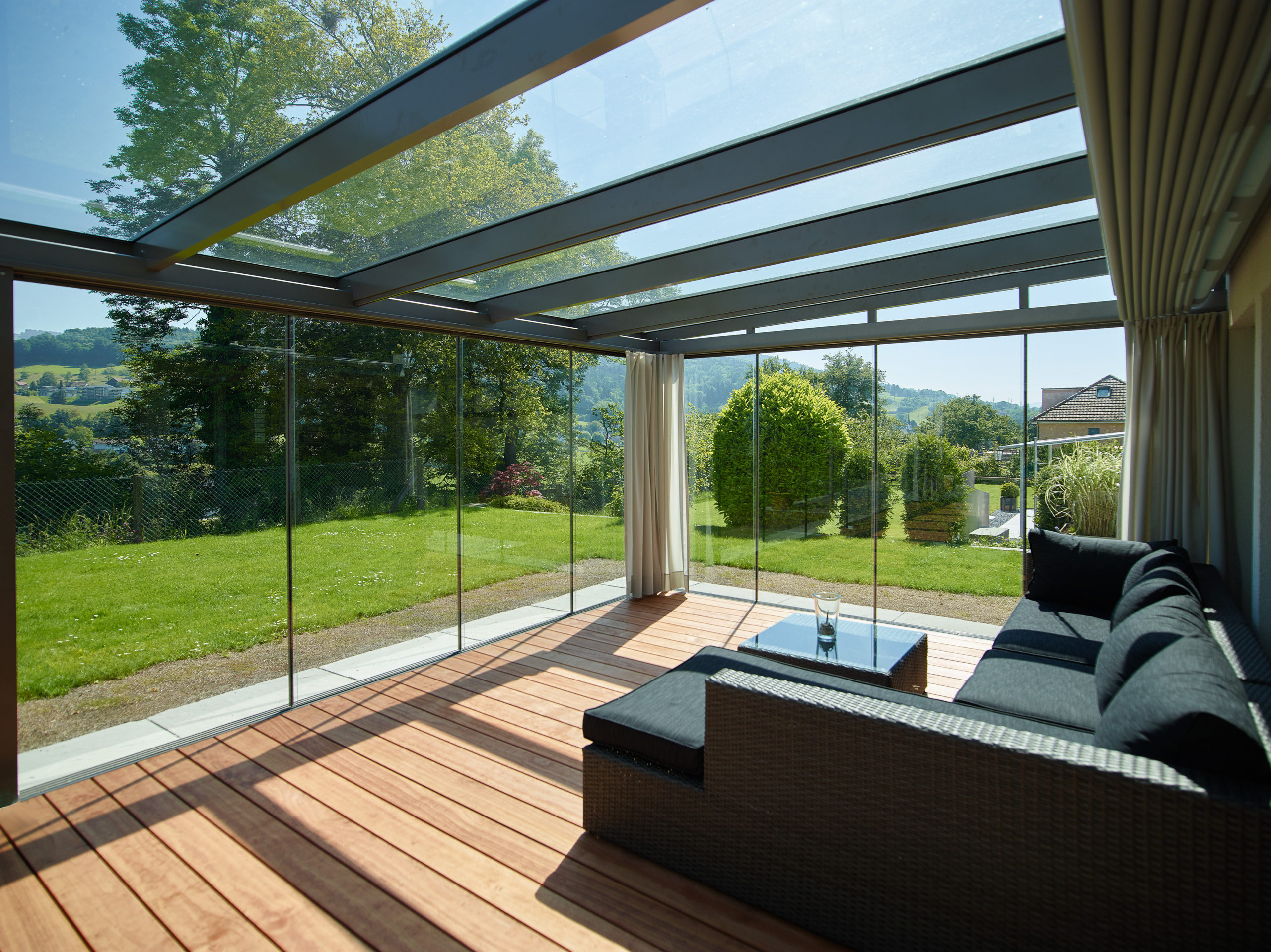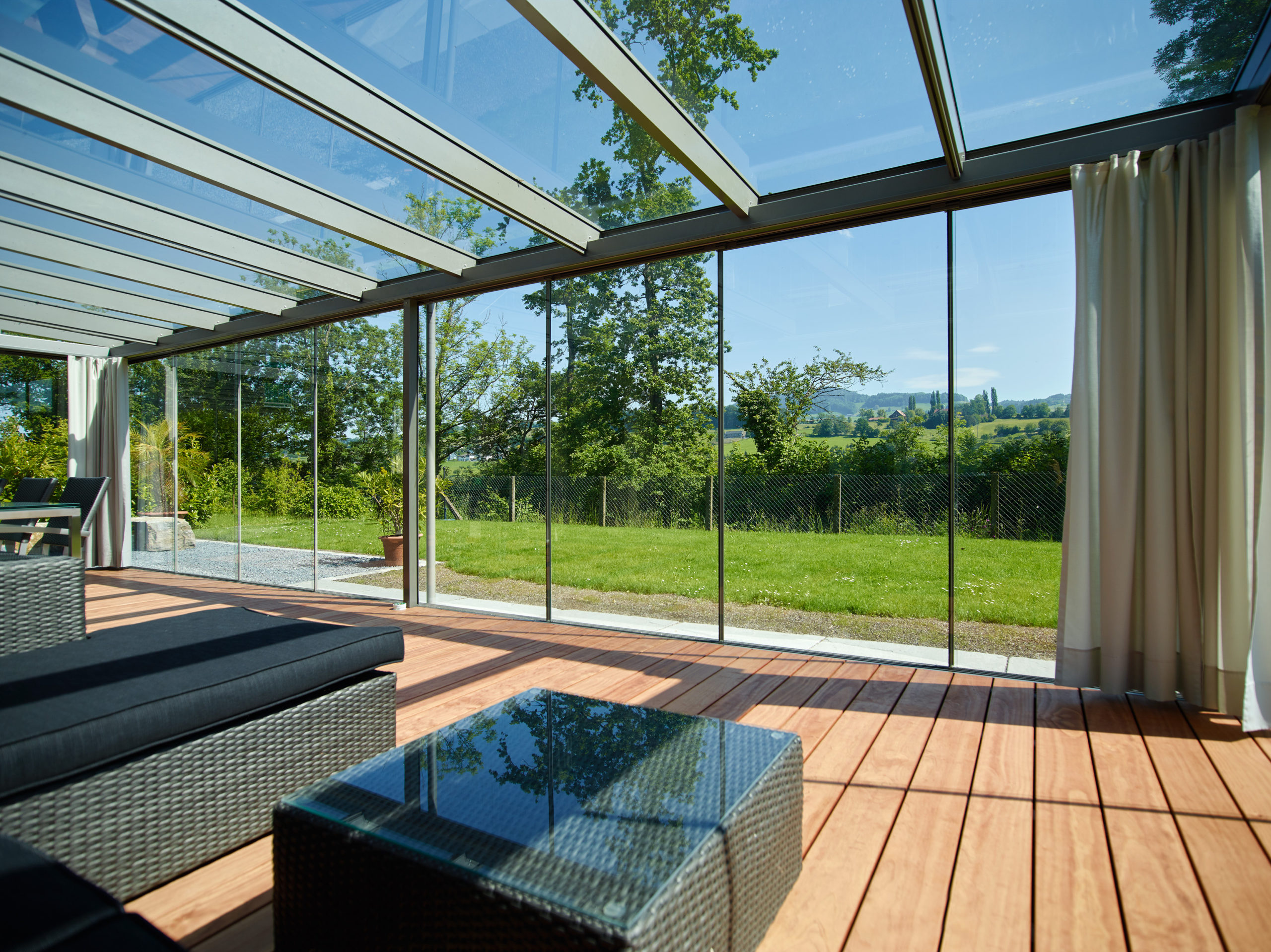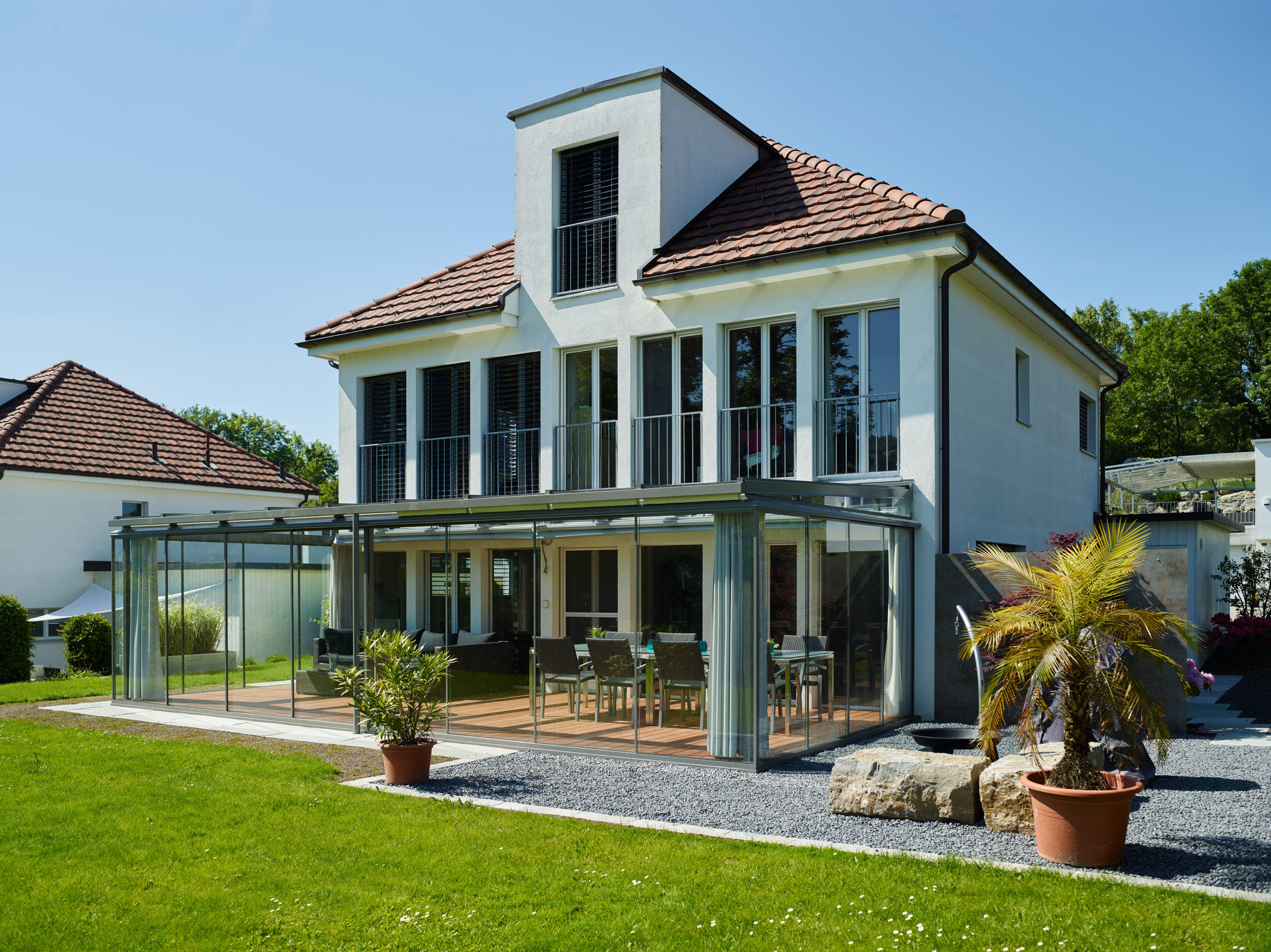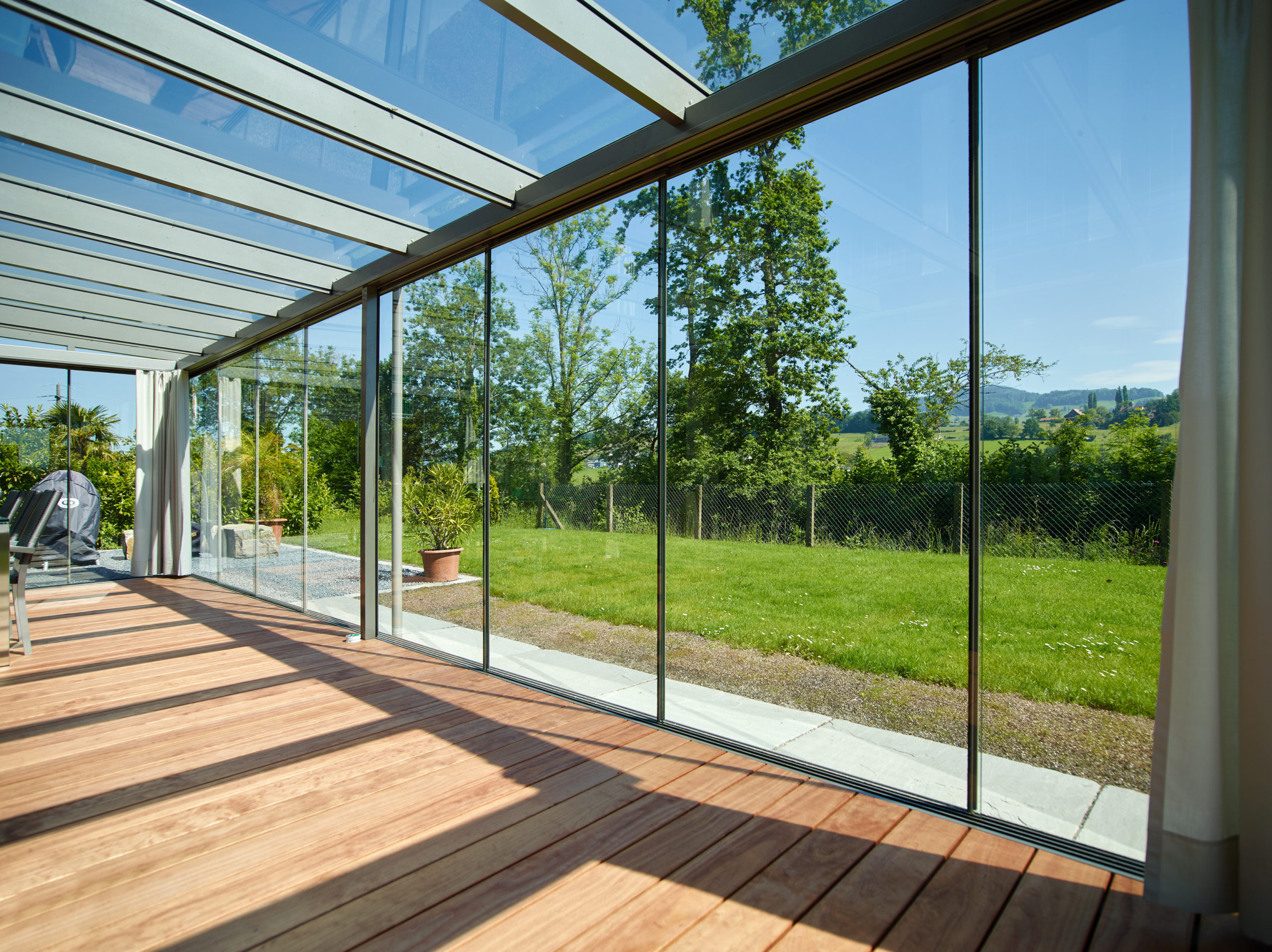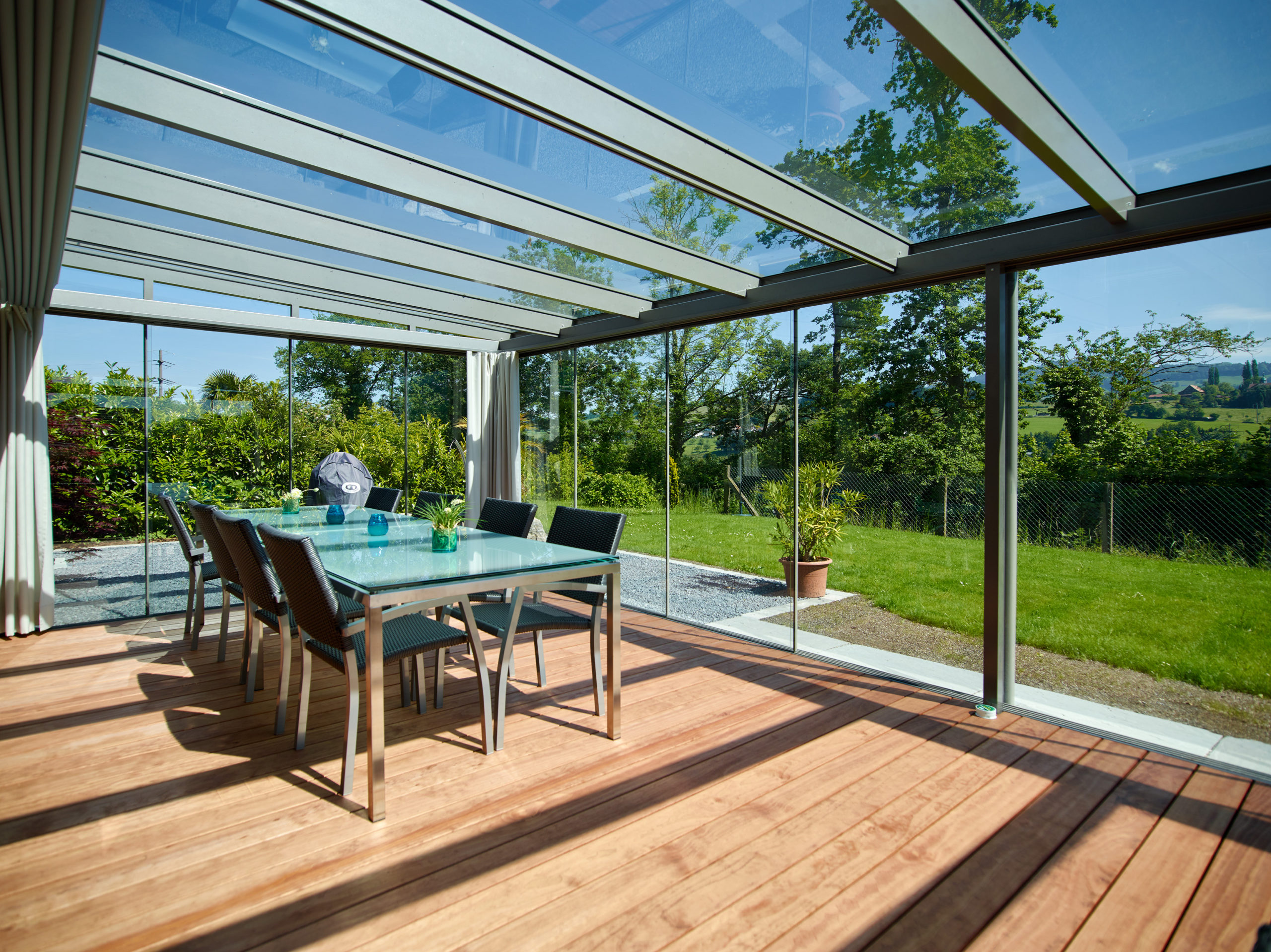 Familie H entschied sich für einen großzügigen, einfachverglasten Wintergarten, der eine Sitzlounge und einen großen Esstisch beherbergt – ideal für Feiern und gesellige Grillabende. Zwar speichert die Einfachverglasung die Sonnenwärme nicht langfristig, doch sie schützt zuverlässig vor Wind und Wetter und verlängert die Sommersaison von Frühling bis in den Herbst hinein.