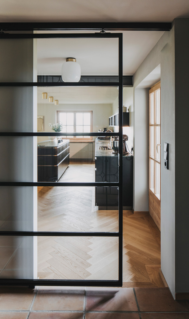 Beim Umbau des Einfamilienhauses Amann-Thurner war das Ziel, den Industrial-Style bei den Raumabtrennungen aufzugreifen. Dies ist sowohl mit einer wunderschönen, funktionalen Schiebetür als Abtrennung zwischen Küche und Gangbereich gelungen als auch mit einer Tür zwischen Weinkeller und Garderobenbereich. So gewinnen die Türelemente an Stil, ohne Licht zu verlieren. Das bringt eine klare Aufwertung der Wohnräume und Funktionalität für die Familie.