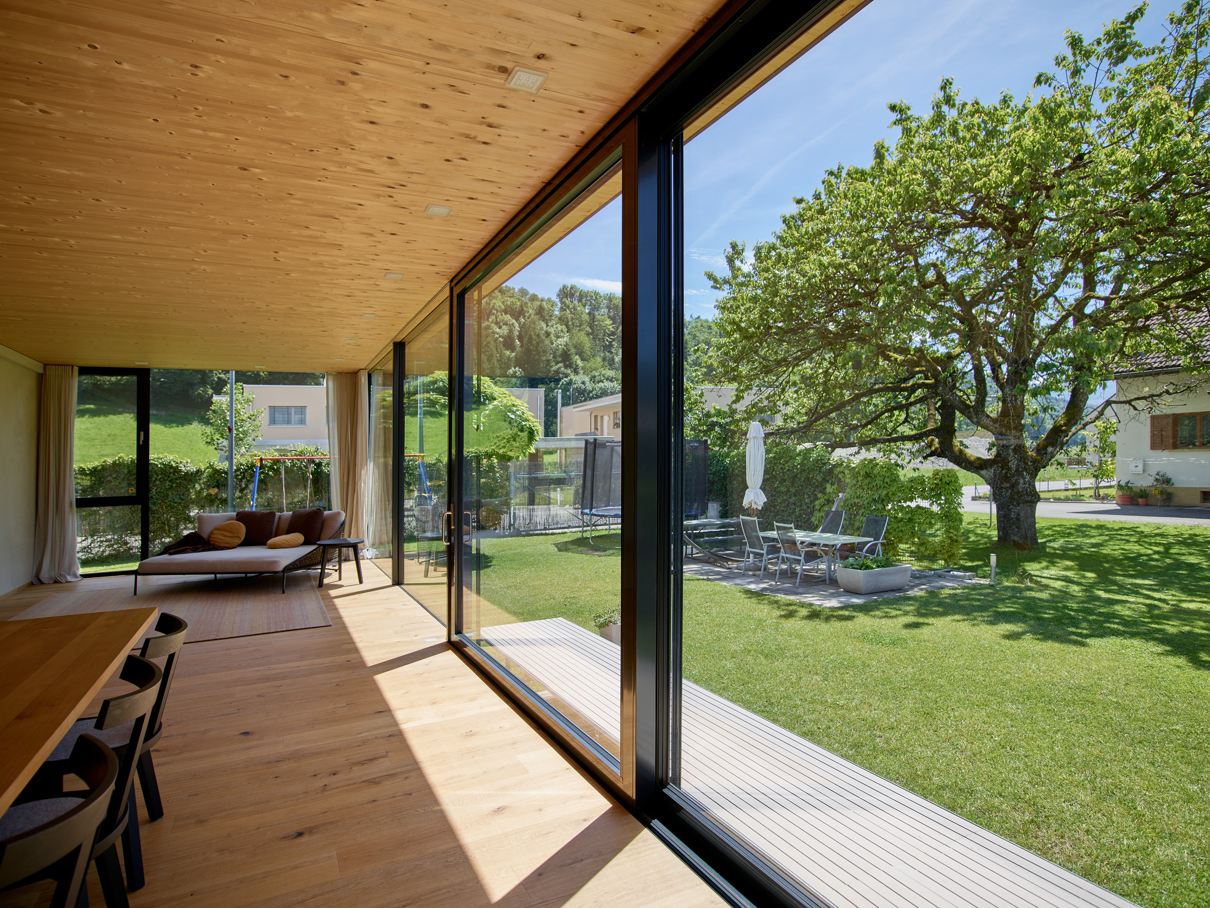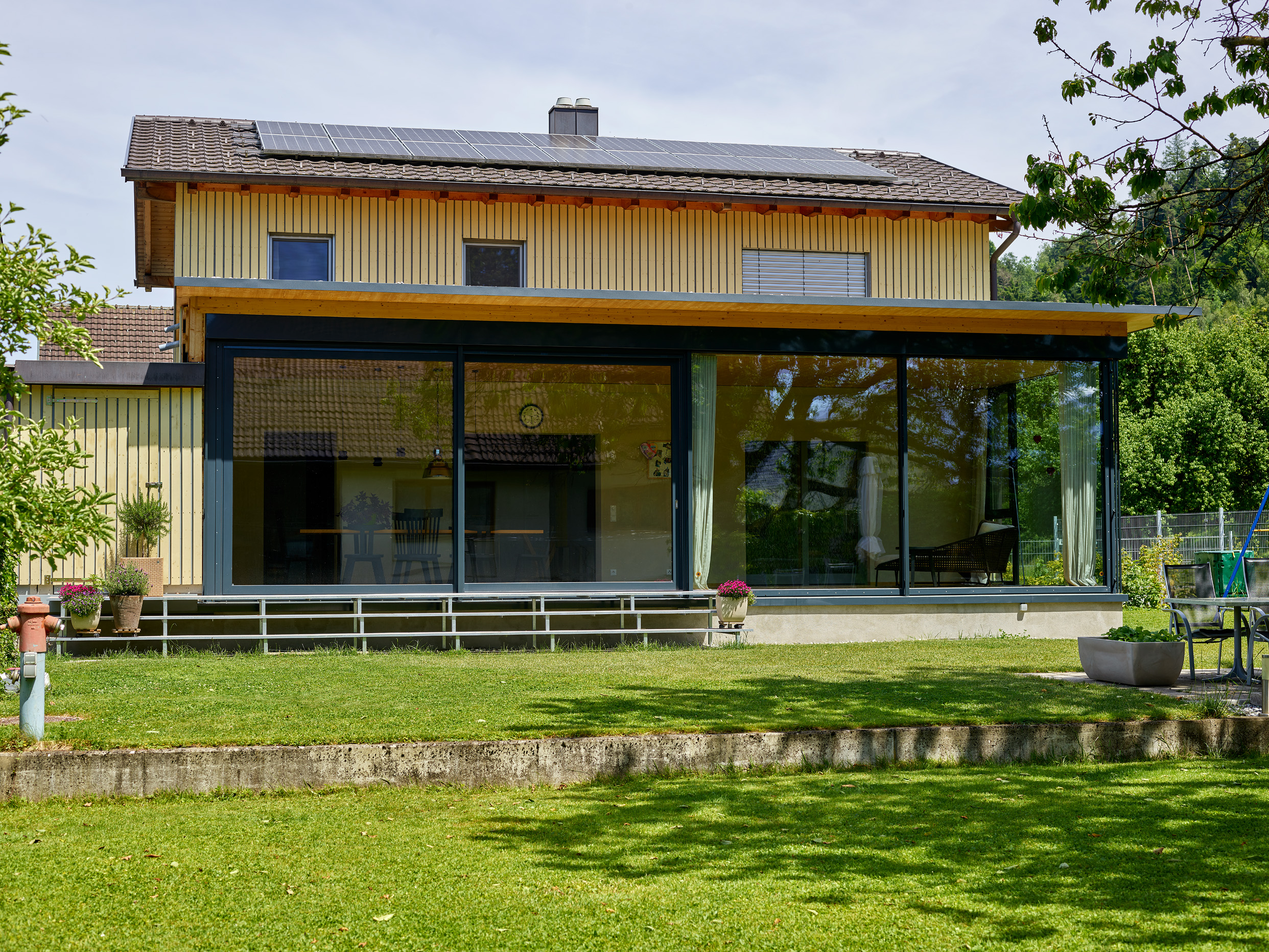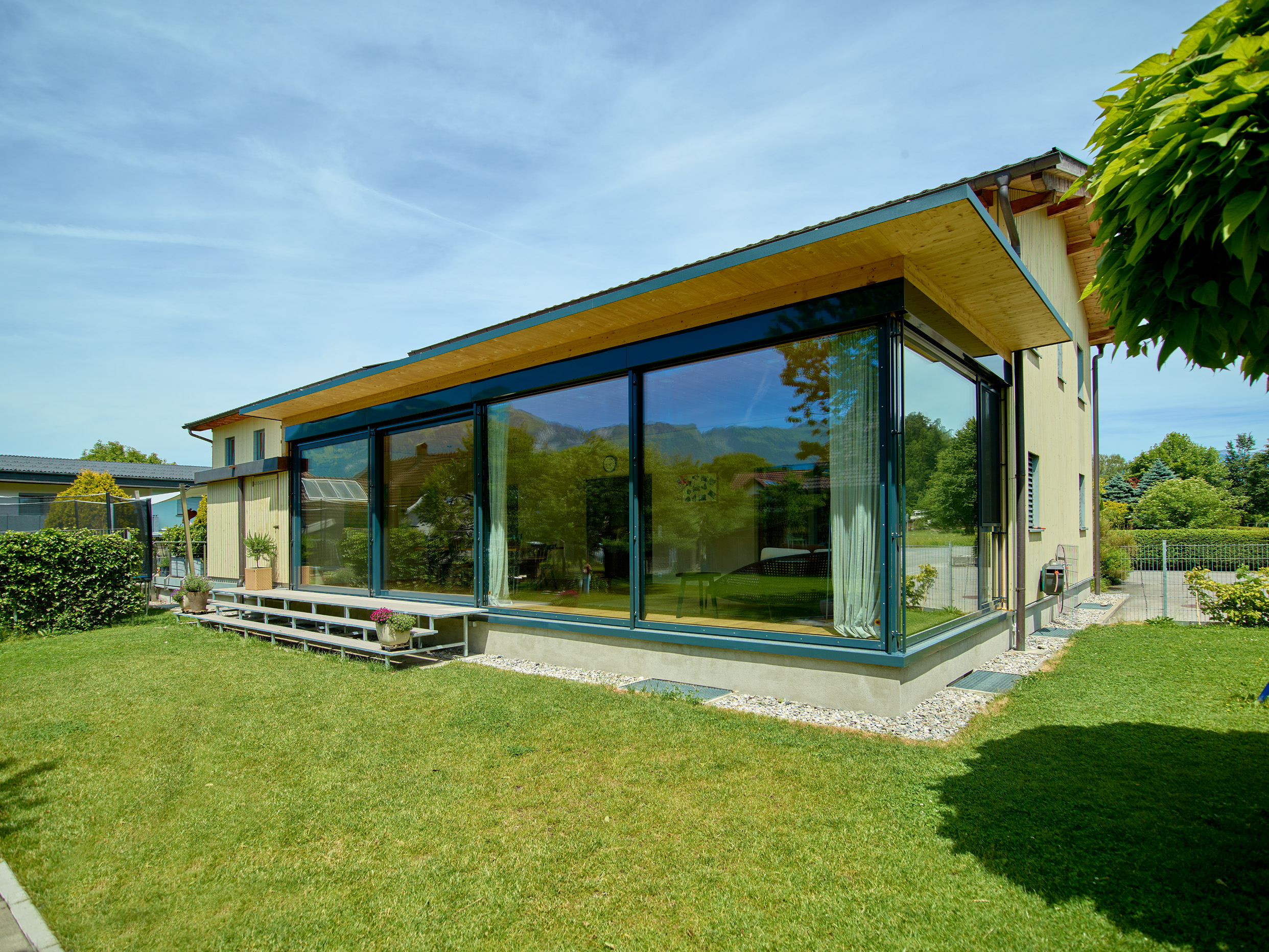 Der großzügige Wohnraumwintergarten der Familie S in Feldkirch schafft zusätzlichen Raum für einen eleganten Loungebereich sowie einen großzügigen Esstisch. Der Anbau wurde mit einem modernen Flachdach realisiert und harmonisch in den Bestand integriert, wobei die Außenwände in stilvolle Lehmwände umgestaltet wurden. Der direkte Zugang zum Garten erfolgt über eine weitläufige Stahltreppe sowie eine große Hebe-Schiebeanlage. Dieser lichtdurchflutete Raum inmitten der Natur steigert die Wohnqualität spürbar und schafft ein einzigartiges Wohngefühl.