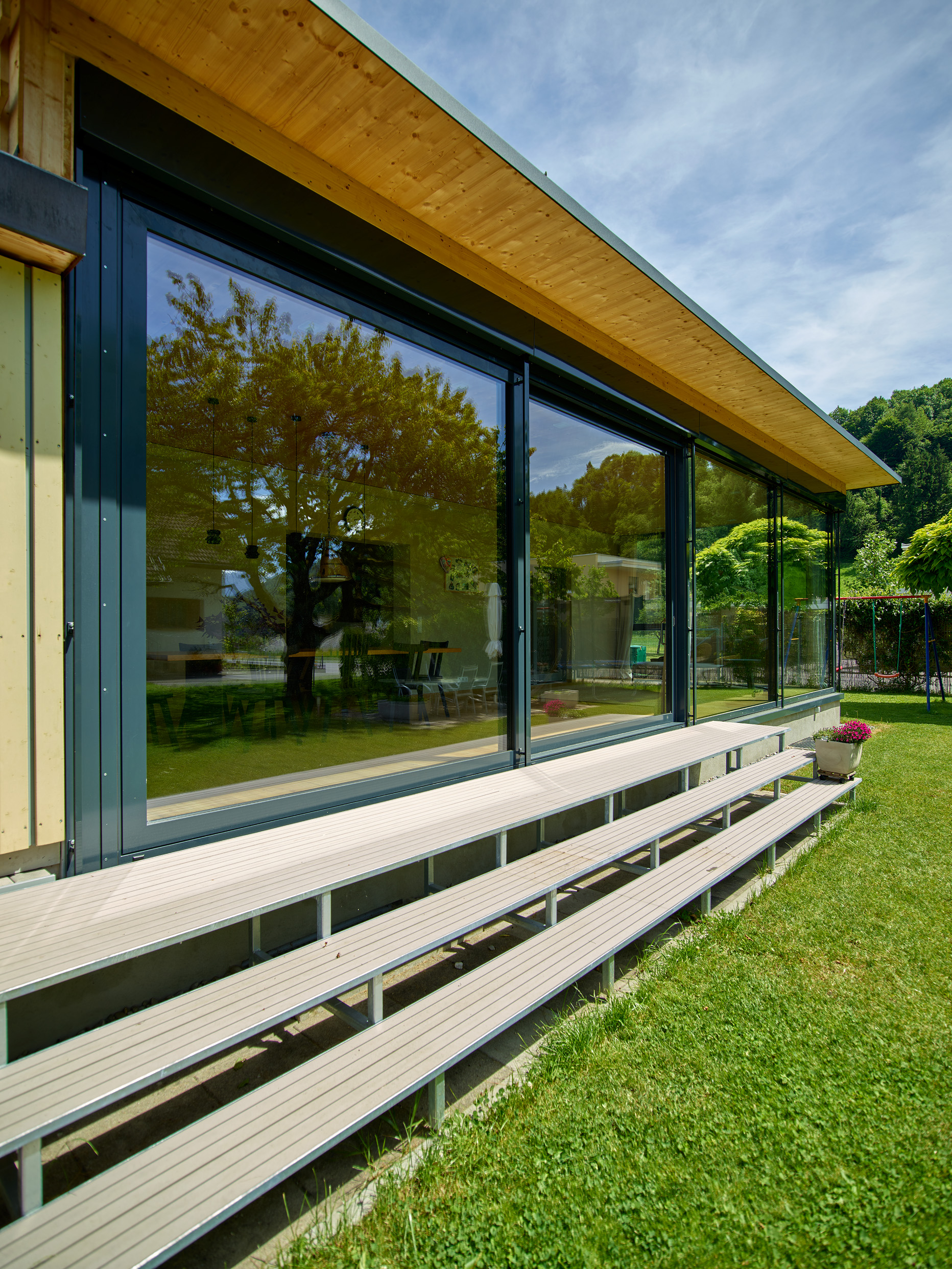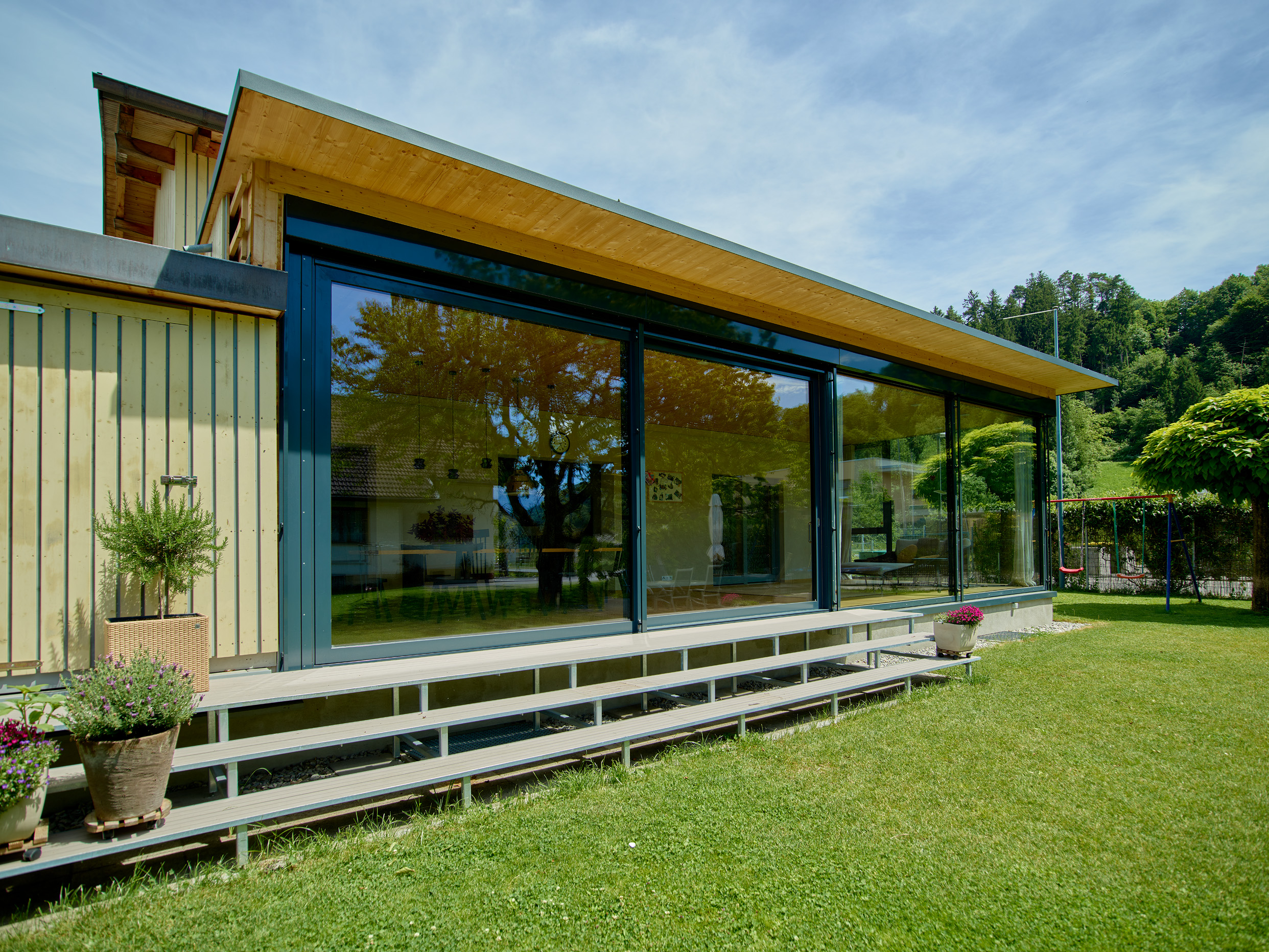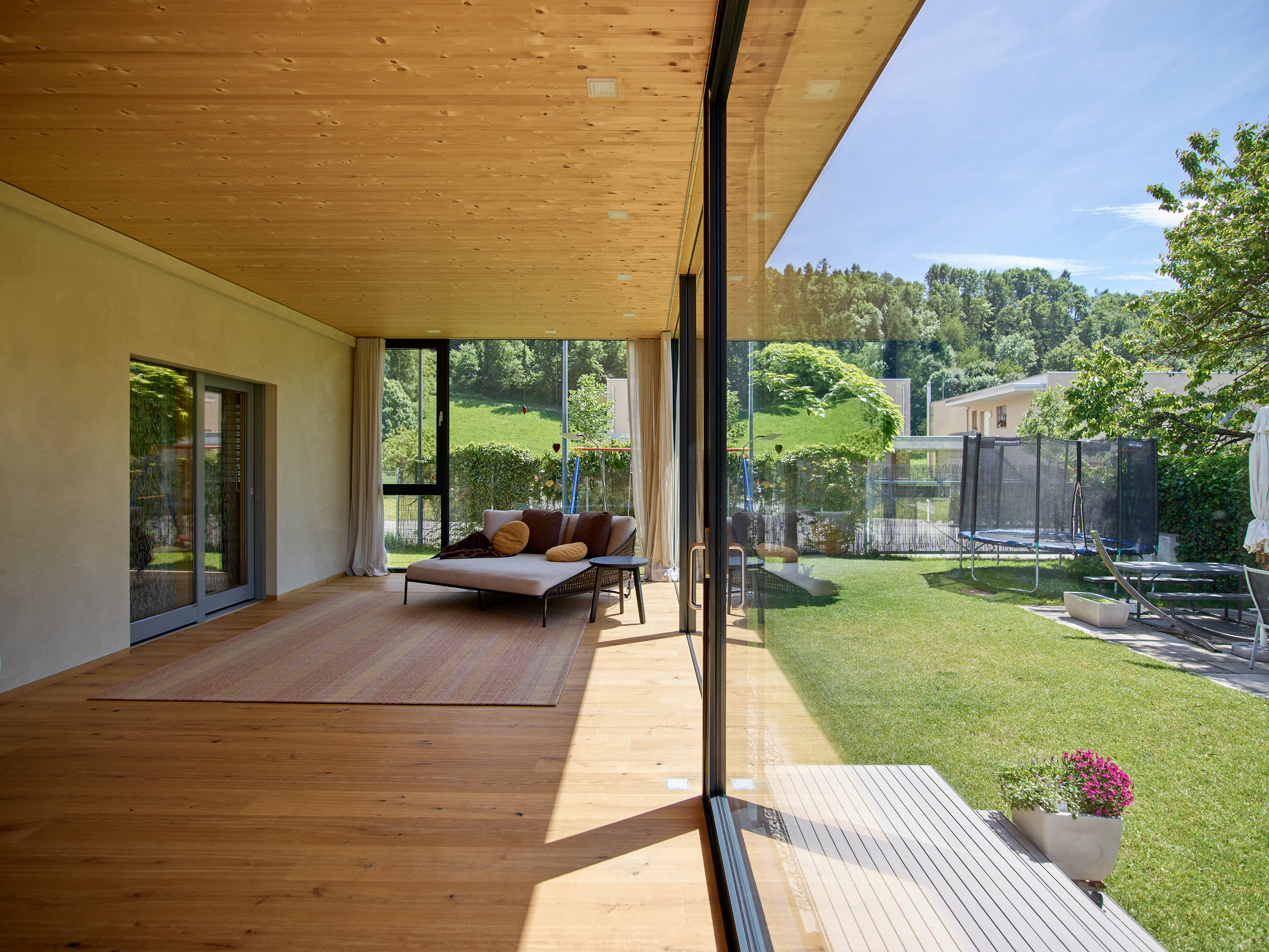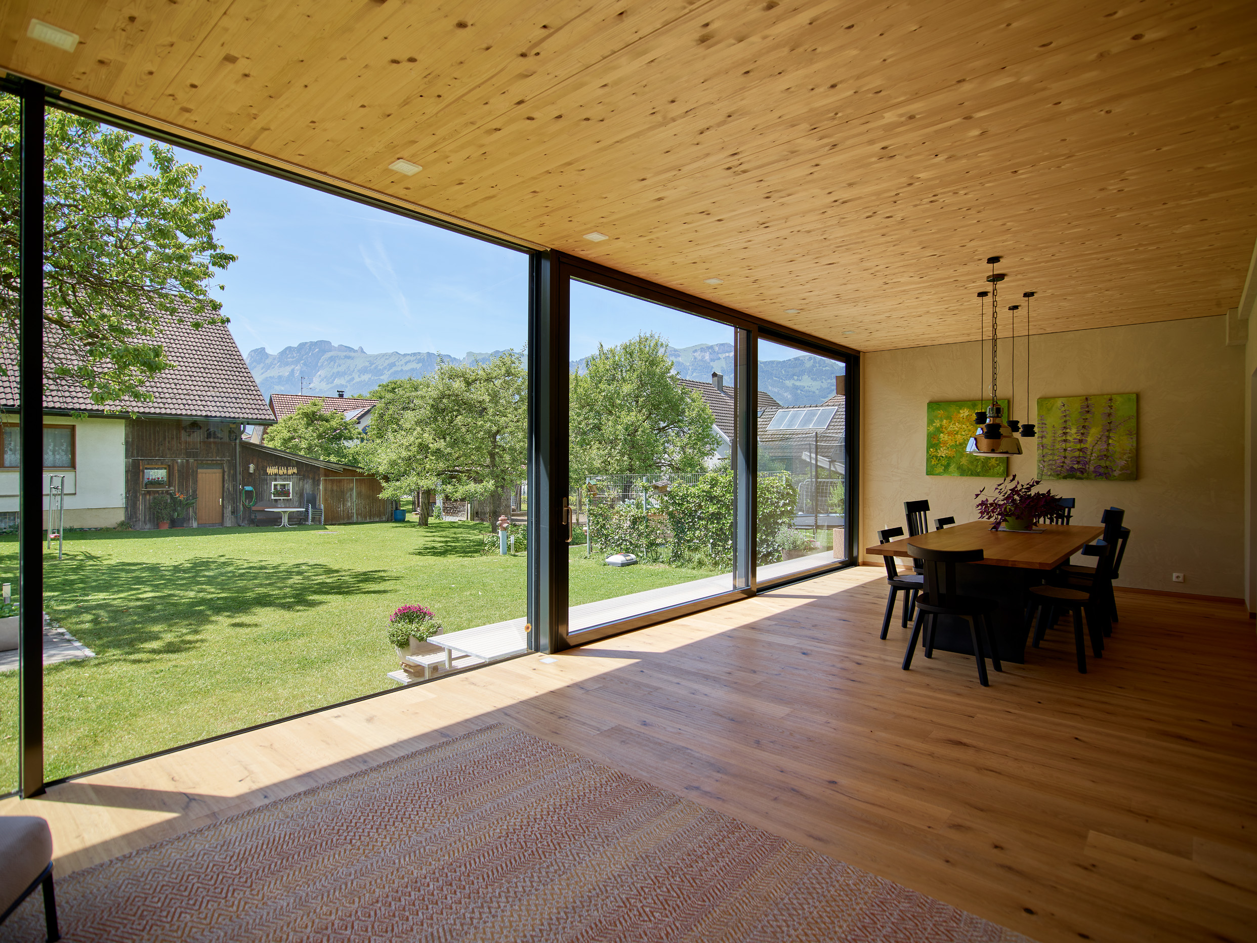 Der großzügige Wohnraumwintergarten der Familie S in Feldkirch schafft zusätzlichen Raum für einen eleganten Loungebereich sowie einen großzügigen Esstisch. Der Anbau wurde mit einem modernen Flachdach realisiert und harmonisch in den Bestand integriert, wobei die Außenwände in stilvolle Lehmwände umgestaltet wurden. Der direkte Zugang zum Garten erfolgt über eine weitläufige Stahltreppe sowie eine große Hebe-Schiebeanlage. Dieser lichtdurchflutete Raum inmitten der Natur steigert die Wohnqualität spürbar und schafft ein einzigartiges Wohngefühl.